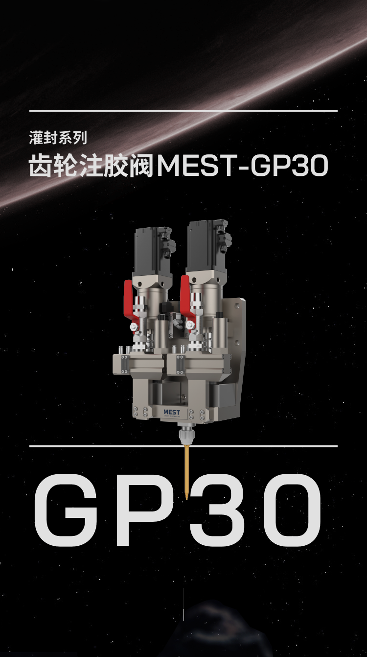 齒輪注膠閥 MEST-GP30 作為一種連續(xù)灌封的體積式注膠頭,適用于處理從低粘度到高粘度、非研磨性的單、雙組份灌封材料。